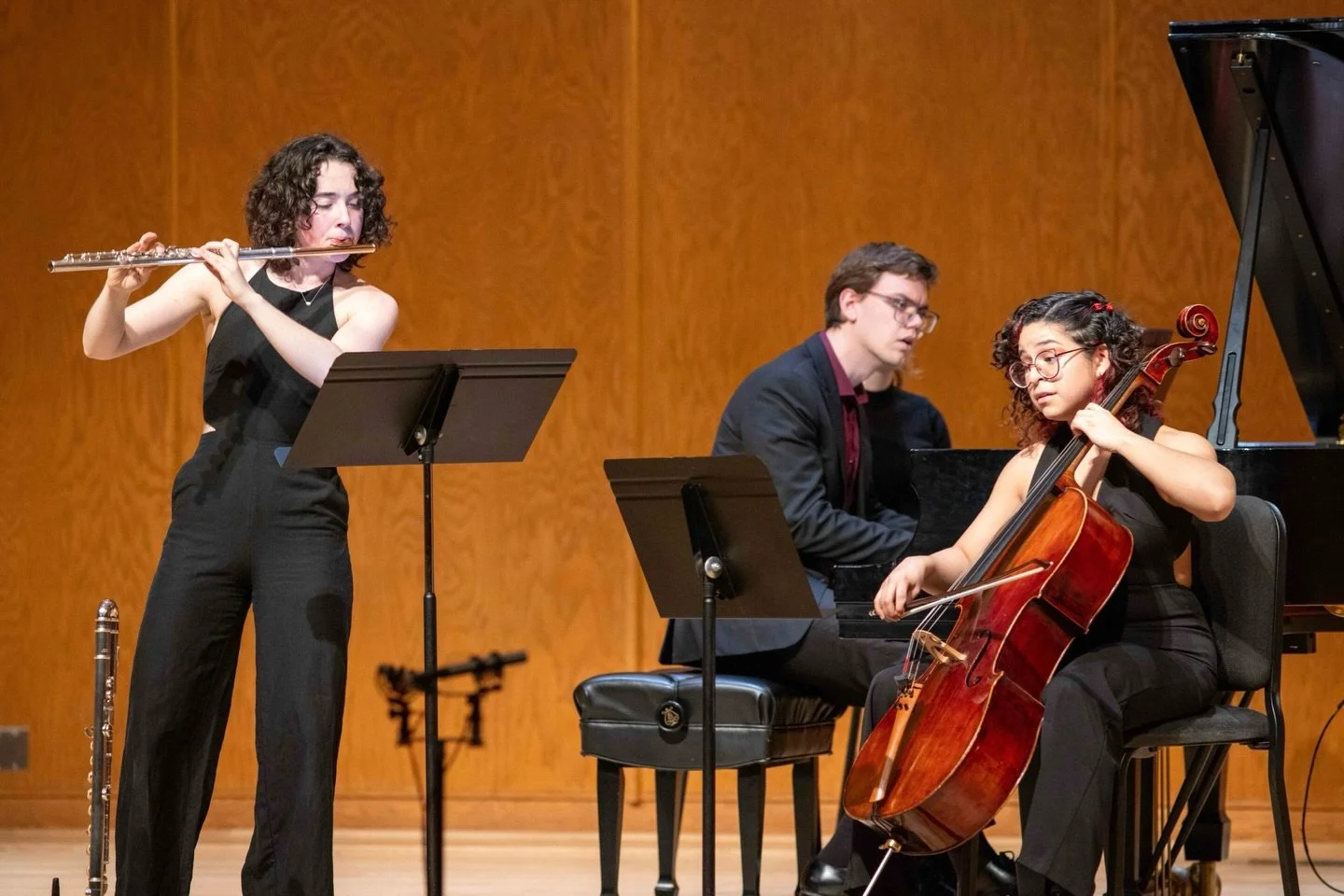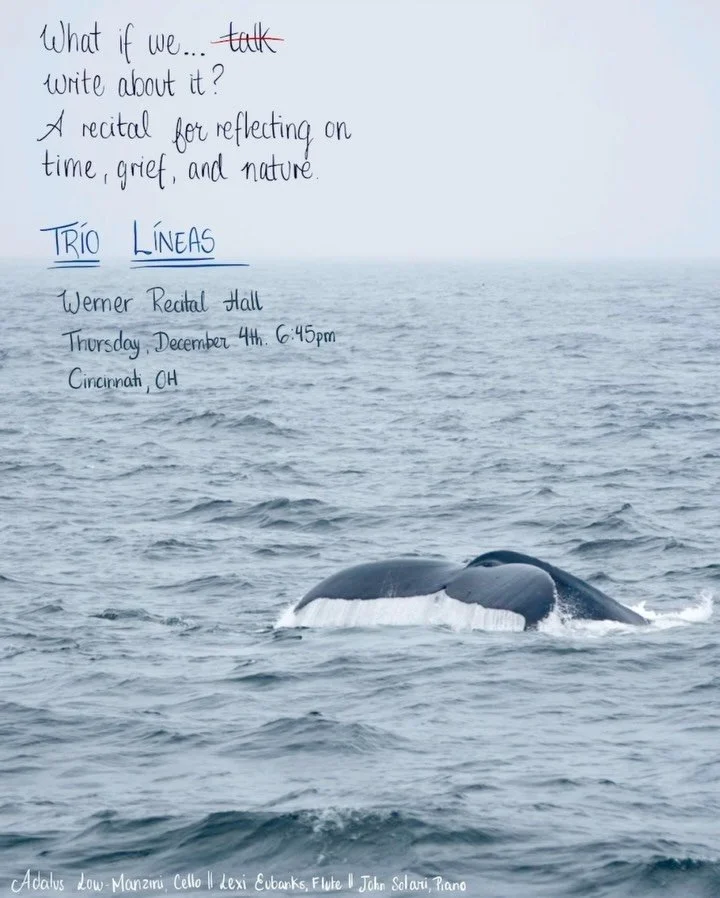 Comprised of Alexis Eubanks, flute, Adalus Low-Manzini, cello, and John Solari, piano, the trio has engaged in coachings from violinist Matt Albert (founder and former member of Eighth Blackbird), violinist Annie Fullard (member of the Cavani Quartet), Jayce Ogren (conductor at the University of Michigan), Chen Yi (composer and composition professor at the University of Missouri–Kansas City), and Steve Beck (Pianist of the Da Capo Chamber Players). Trío Líneas’ debut performance was George Crumb’s Vox Balaenae at the University of Michigan’s historic Hill Auditorium as part of the Contemporary Direction Ensemble’s “The Legacy of George Crumb: Voices and Echoes” Concert Series. In 2024, they were featured in the University of Michigan’s annual Collage Concert, performing Gabriela Ortiz’s Tepito.